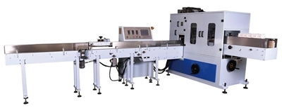 三維包裝機是抽紙流水線配套使用的包裝設備,包裝膜經切刀切成符合包裝要求的長度,小包裝盒經輸送機輸送,汽缸推動堆垛(按要求的的形式和數量),裹膜和折疊包封形成一中型包裝。
